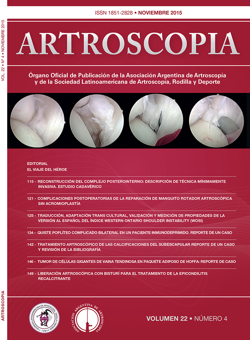 La revista ARTROSCOPIA es publicada por la Asociación Argentina de Artroscopia en conjunto con la Sociedad Latinoamericano de Artroscopia, Rodilla y Deporte.
