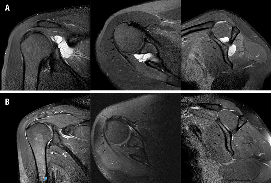 Figura 1: A- Lesión ligamentaria lateral del tobillo, B- Lesión osteocondral medial del astrágalo.