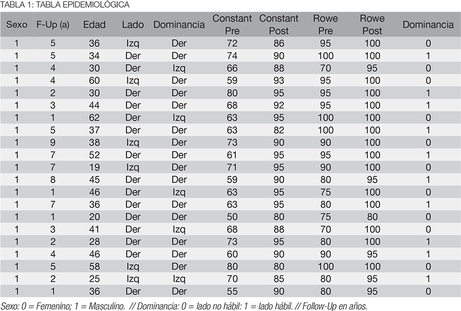 Los 20 pacientes fueron evaluados con un seguimiento promedio de 25 meses postoperatorio. Para su evaluación se utilizó la escala de puntuación de VAS y de Karlsson-Peterson pre y postoperatoria.