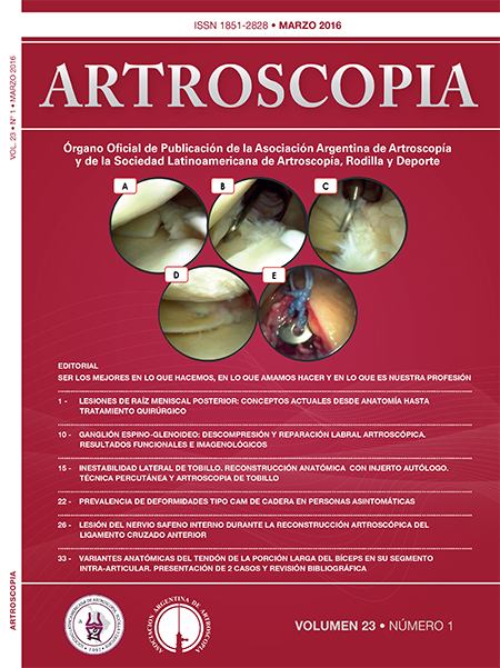 La revista ARTROSCOPIA es publicada por la Asociación Argentina de Artroscopia en conjunto con la Sociedad Latinoamericano de Artroscopia, Rodilla y Deporte.