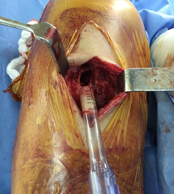 El tratamiento quirúrgico en todos los pacientes comprendió la resección del quiste sinovial de contenido seroso, se extrajo el tornillo biodegradable en aquellos que presentaban uno, al igual que las grapas y remanentes de sutura o fibrosis. Se enviaron muestras a anatomía patológica y cultivo. Además, se realizó una artroscopía confirmando la indemnidad del neo-ligamento (fig. 2), y la ausencia de pasaje de líquido desde la articulación al túnel tibial. Luego esto se realizó un curetaje de las paredes del túnel y en siete casos se rellenó el túnel tibial con injerto óseo autolólogo. El injerto se obtuvo en cinco pacientes de la tibia proximal y en dos del cóndilo femoral externo de la misma rodilla (fig. 3). Para el cierre se utilizó Vicryl® 2/0 para tejido celular subcutáneo y Nylon® 3/0.