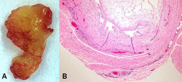 Figura 4: A) Pieza quirúrgica. B) Histología de la pieza.