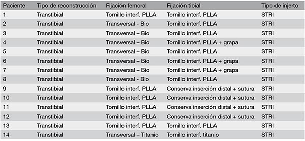 En todos los pacientes el túnel femoral se realizó con técnica transtibial. En cuanto a las fijaciones, en ocho pacientes se utilizó una fijación con pin transversal biodegradable a nivel femoral y un tornillo biodegradable para la fijación tibial (aumentando la fijación con una grapa de titanio en tres casos). En 4 pacientes a nivel femoral se fijó con un tornillo biodegradable (Delta-Bio Arthrex) y a nivel tibial se conservó la inserción natural de los isquiotibiales. En un paciente se fijó con un tornillo interferencial biodegradable en fémur y otro en la tibia. En el paciente restante se fijó en fémur con un poste de titanio y con un tornillo interferencial de titanio en tibia. La Tabla 2 muestra los tipos y técnica de reconstrucción, injerto y fijación de la cirugía primaria de LCA.