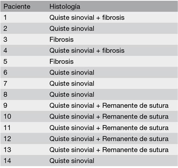 Resultados: Nueve hombres y 5 mujeres con edad promedio de 38 años. El seguimiento promedio fue de 35 meses. Todos operados con isquiotibiales cuádruple y técnica trans-tibial. El tiempo promedio entre la cirugía de LCA y aparición del quiste fue de 29 meses. Clínicamente presentaban una tumoración entre 1.1 y 3 cm sin signos de inestabilidad. A través de Rx y RM se evidenció ensanchamiento del túnel tibial en todos los casos. Se rellenó el túnel tibial con injerto óseo en 7 casos. La anatomía patológica informó: 12 quistes sinoviales (5 asociados a remanentes de sutura) y 2 casos únicamente fibrosis. Un paciente evolucionó con recidiva.