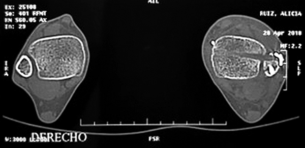 Figura 6: Tomografía comparativa de ambos tobillos, corte axial a 2 cm de la articulación con reducción aceptable.