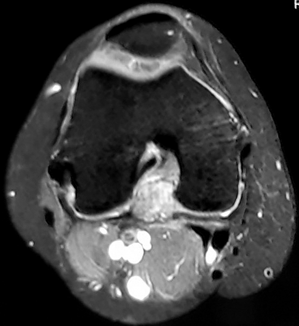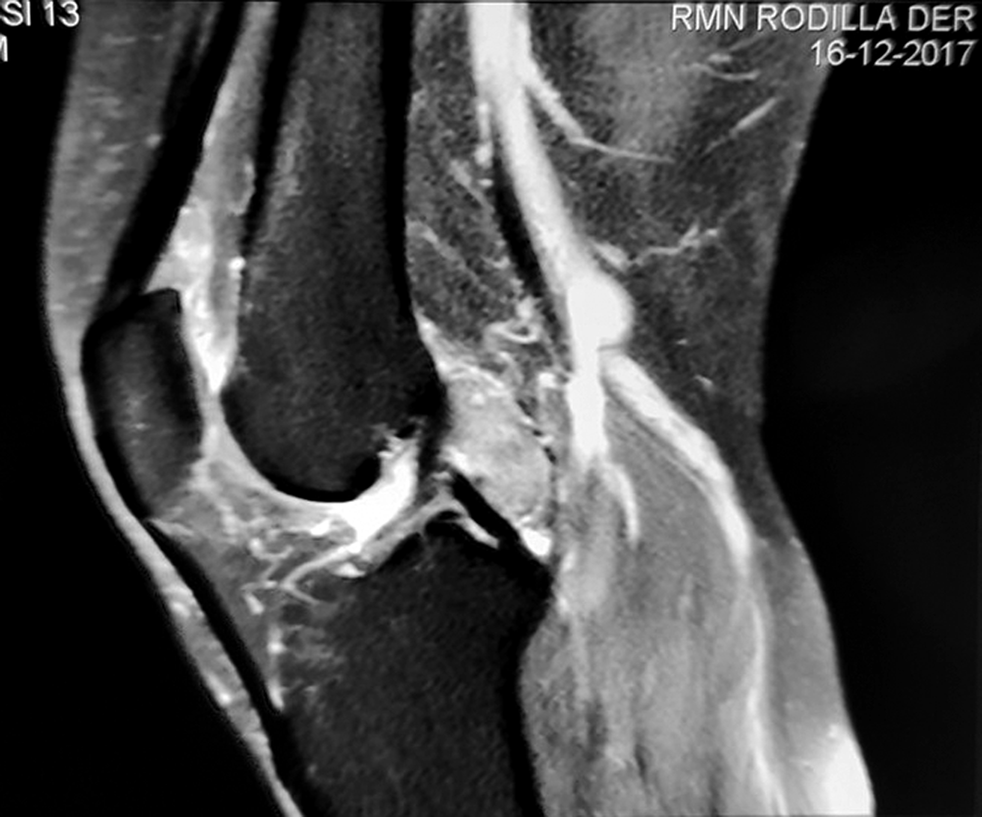 Paciente de 46 años de edad de sexo femenino consulta por dolor de rodilla derecha de dos meses de evolución, asociada a aumento de volumen, con limitación progresiva de la capacidad de realizar actividades cotidiana con episodio de bloqueo articular que resolvió espontáneamente. Al examen físico, se observa limitación de la extensión completa de 10º asociada a marcha claudicante. A la palpación se constata una pequeña masa tumoral en hueco poplíteo, dolorosa, duroelástica adherida a planos profundos. Se solicitó RMN donde se observa una masa heterogénea en T1 y T2 de naturaleza intraarticular localizada en intercóndilo posterior de la rodilla (figs. 1 y 2). Se planteó como diagnóstico diferencial sinovitis vellonodular pigmentaria o tumor tenosinovial de células gigantes. Por protocolo de servicio y para ir a la cirugía definitiva con diagnostico de certeza se realizó una biopsia guiada por TAC. La histopatología confirmó nuestra segunda hipótesis diagnóstica.