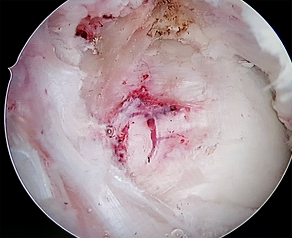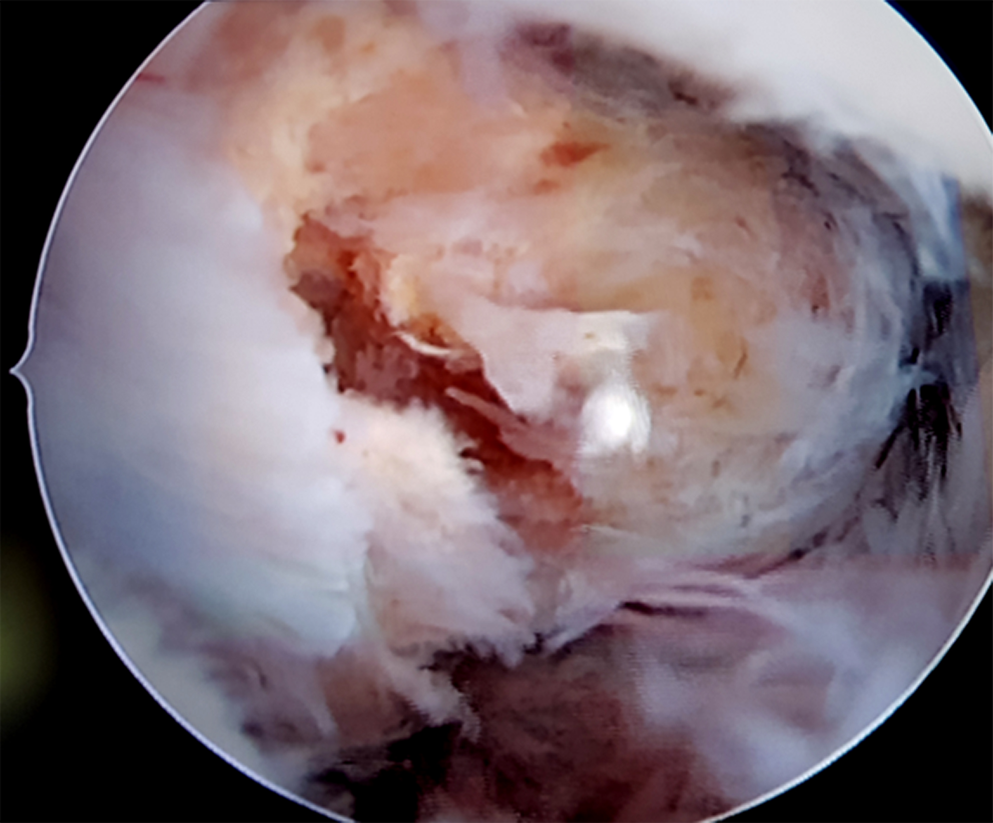 Figuras 3, 4 y 5: Superior derecha e izquierda: Se observa visión artroscópica por portal anterolateral y posteromedial, localización retro LCP. Inferior: Visualización artroscópica posterior a exéresis completa.