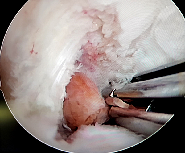 El paciente fue derivado al equipo de artroscopia de rodilla para evaluar la resección artroscópica de la misma. Se realizaron tres portales. El portal AL y AM estándar con objetivo el desbridamiento periférico en región anterior con preservación marginal. El portal PM con el objeto del desbridamiento periférico posterior y la exéresis en bloque de la pieza, lo cual se logro sin dificultad ni necesidad de realizar artrotomía (figs. 3, 4 y 5).