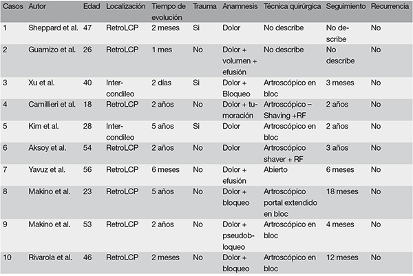 Los tumores tenosinoviales de células gigantes pueden originarse de forma retro-LCP o localizarse en fosa intercondílea. Estos casos pueden verse asociados a sintomatología mecánica que precipita la consulta. Debe realizarse diagnóstico diferencial en RMN con otras patologías. De realizarse un diagnóstico de variante nodular, la técnica artroscópica de resección en bloque es una alternativa de tratamiento que no presenta mayor tasa de recidiva que otras técnicas en la bibliografía publicada.