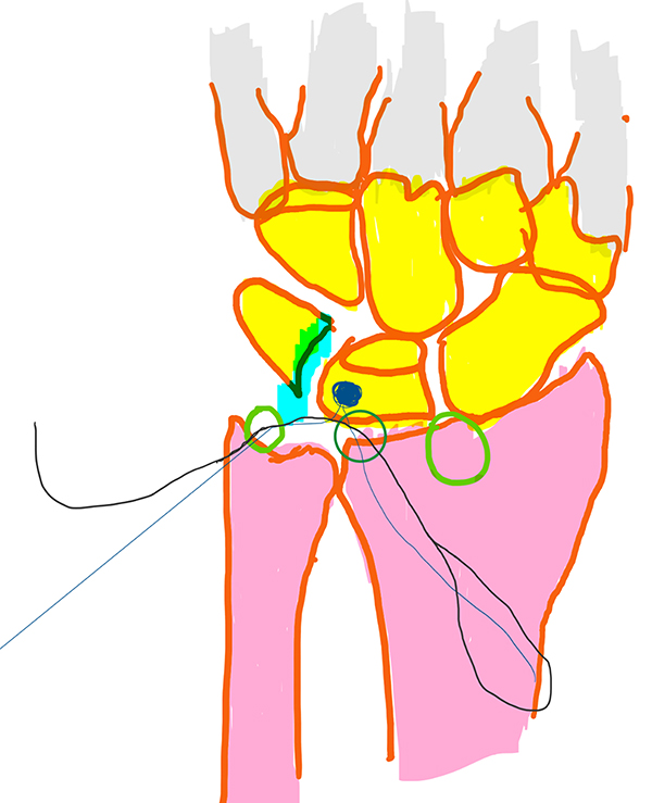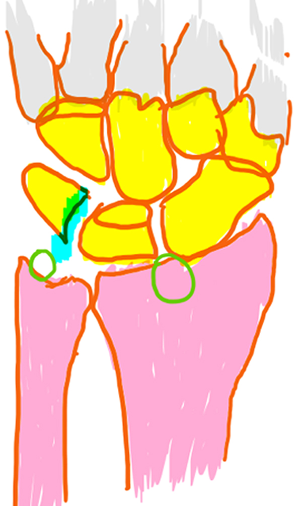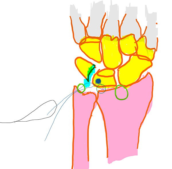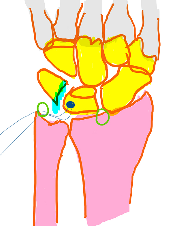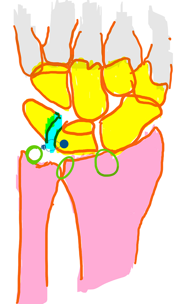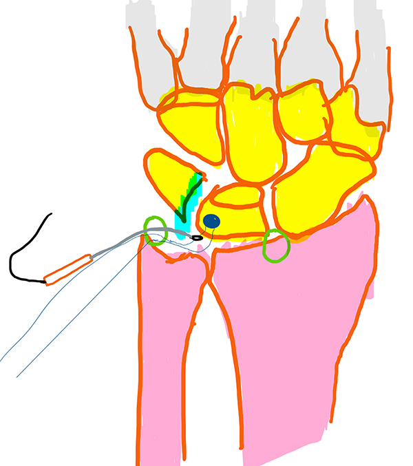 Esquema 1: Desinserción de ligamento lunopiramidal con portales 3/ 4 y 6R.
