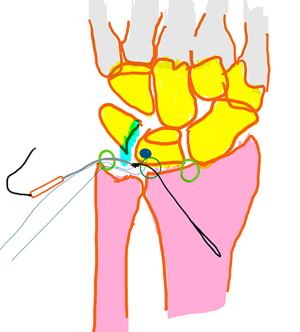 Esquema 3: Primera pasada realizada. Colocación del Suture lasso con el suture retriver por dentro y penetración del ligamento lunopiramidal.