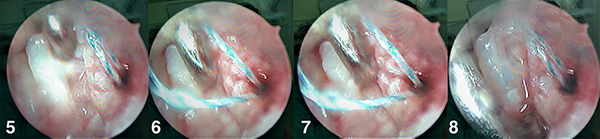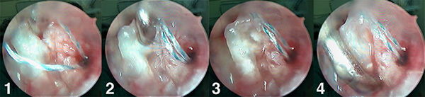 Posterior a esto, mediante el mismo capturador de hilos rescatamos uno de los hilos que salen por el portal 6r y lo retiramos por el portal 4/5. Fuera de la articulación colocamos el hilo rescatado por dentro del sutura retriver (Arthex) y desde el portal 6r retiramos el suture retriver (Arthrex) con visión desde portal 3/4, observando cómo sale el hilo a través del ligamento desde el portal 4/5 hacia el 6r nuevamente.