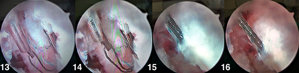 Figuras 13, 14, 15 y 16: Se retira por el portal 4/5 el suture retriever (Arthrex) mediante un atrapador de suturas y se retira por fuera del portal.