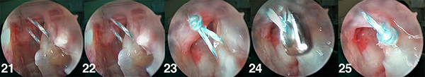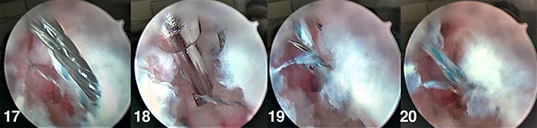 Figuras 17, 18, 19 y 20: Se retira por el portal 4/5 uno de los hilos del anclaje óseo y por fuera del portal se coloca dentro del suture retriver, luego se saca el suture retriver (artrhex) por el portal 6r y pasa el hilo por el ligamento.