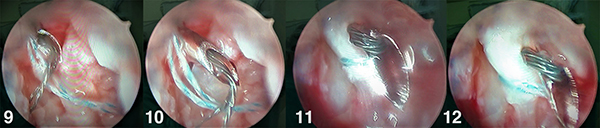 Figura 9, 10, 11 y 12: Se coloca el Suture Lasso (Arthex) con el suture retriver (Arthrex) por el portal 6R con visión por ¾ y se penetra el ligamento desde cubital a radial.