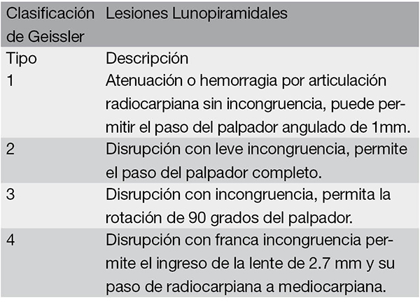 Un punto de interés es que las clasificaciones que encontramos sobre lesiones del ligamento lunopiramidal no contemplan la desinserción de este ligamento, por lo que los autores de este trabajo no encontramos un estadio de alguna de las clasificaciones utilizadas para realizar este procedimiento, pero si creemos que es una opción viable a tener en cuenta como alternativa si las características ligamentarias lo permiten.