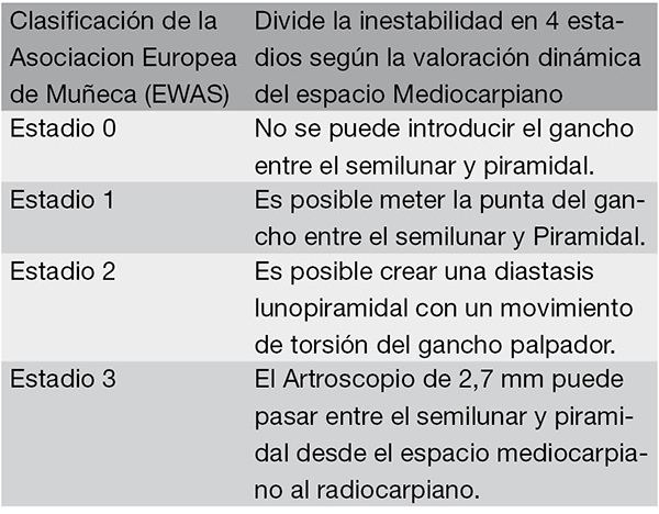 Divide la inestabilidad en 4 estadios según la valoración dinámica del espacio mediocarpiano (tabla 2).