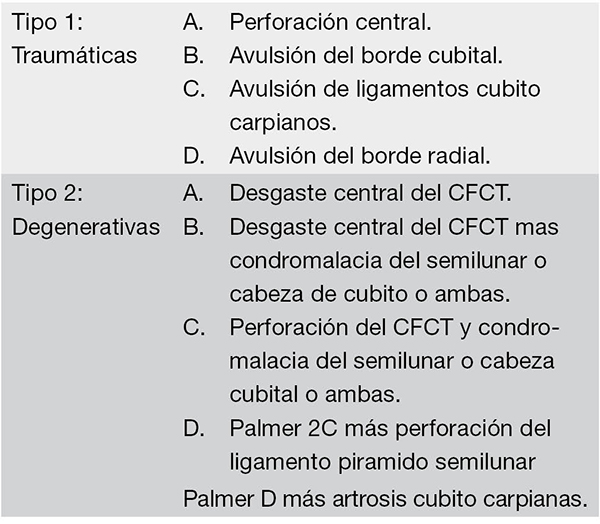 Es parte de la clasificación de Palmer para lesiones del complejo fibrocartílago triangular (CFCT), la incluimos ya que las lesiones degenerativas por inestabilidad de muñeca pueden dar desinserción del Lig LT pasible de reparación (tabla 3).