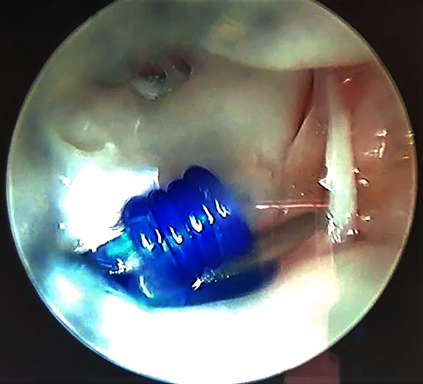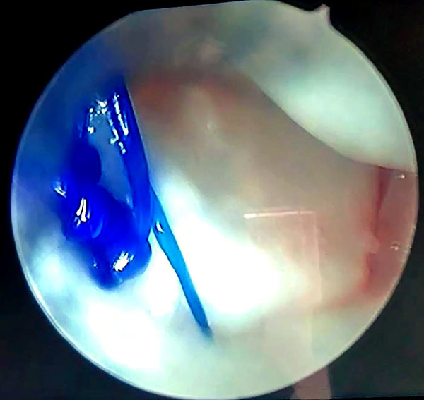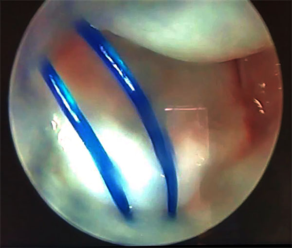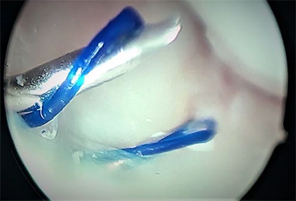 Se realiza visión por portal 6r y se pasa la aguja por la cápsula y uno de los sectores dañados del ligamento escafolunar hacia la articulación mediocarpiana donde se rescata la sutura y se retira por el portal MCR con visión MCU. Se repite este paso con otra aguja paralela a la primera que atraviese la cápsula y la otra parte del ligamento escafolunar dañada, y se rescata la sutura por articulación medio carpiana. Las 2 suturas rescatadas por mediocarpiano se anudan de forma simple, y se realiza el deslizamiento de los extremos de las suturas proximales con visión MCU, consiguiendo que el nudo quede anclado por mediocarpiano en el lig. Escafolunar (figs. 5 a 10).