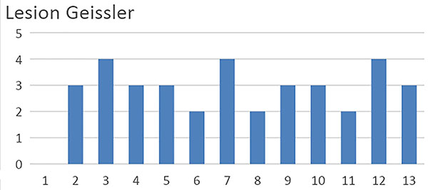Gráfico 1: La columna muestra la clasificación de Geissler y la Fila el número de pacientes.