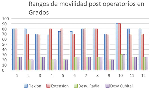 En nuestra serie obtuvimos un rango de movilidad de 65° para la flexión, 71° de extensión, 25° de desviación cubital y 25° de desviación radial. No hemos realizado evaluación pre operatoria de rangos de movilidad.