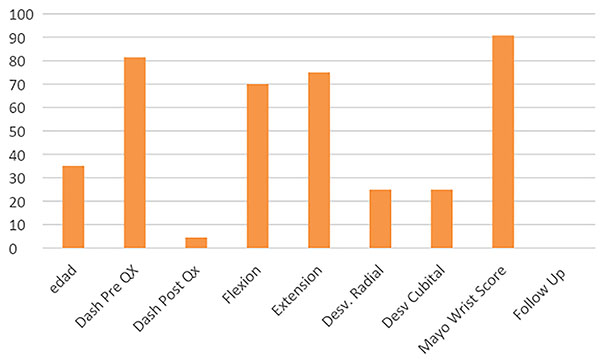 Results: We have had improvements in pain and strength tests, the average ROM was 71° for extension, 65 ° for flexion, 25 ° for radial deviation and 25 ° for ulnar deviation. The Wrist Score of May was excellent at 75%, Good at 16.6%, Satisfactory at 8.33% and we have not had bad results. With respect to the Dash Score, the average in the pre-operative was 81.5 points and in the Post-operative to the date of 4.5 points. The average of the contralateral comparative force was 84%.