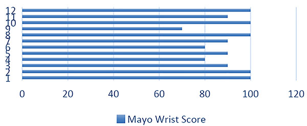 Resultados: Hemos tenido mejoras en test del dolor y la fuerza, el ROM promedio fue 71° para la extensión, 65° de flexión, 25° para la desviación radial y 25° de desviación cubital. El Score de muñeca de mayo fue excelente en el 75%, Bueno en el 16,6%, Satisfactorio en el 8,33% y no hemos tenido malos resultados. Con respecto al Dash Score, el promedio en el pre operatorio fue de 81,5 puntos y en el Post operatorio a la fecha de 4,5 puntos. El promedio de la fuerza comparativa contralateral fue del 84%.