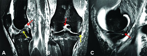 Figura 2: A) Imagen que muestra un corte sagital de Resonancia Magnética Nuclear (RMN) de rodilla donde se observa la avulsión proximal y el remanente del LCA. Flecha Roja (FR): Avulsión Femoral del LCA. Flecha Amarilla (FA): Remanente Completo del LCA. B) Imagen que muestra un corte coronal de Resonancia Magnética Nuclear (RMN) de rodilla derecha donde se observa la avulsión del LCA en su inserción proximal femoral y la lesión del Menisco interno. FR: Avulsión femoral del LCA. FA: Lesión del menisco interno. C) Imagen que muestra un corte sagital de Resonancia Magnética Nuclear (RMN) de rodilla derecha donde se observa la lesión del cuerno posterior del Menisco interno. FR: Lesión del cuerno Post. del Menisco Int.