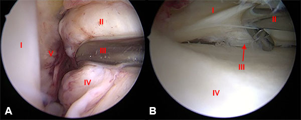 Figura 3: A) Imagen artroscópica de rodilla derecha, vista desde el portal anterolateral, con el paciente en posición supina y la rodilla a 90° de flexión que muestra la lesión tipo I del LCA. I: Cóndilo Femoral Externo. II: Remanente del LCA. III: Palpador. IV: LCA. V: Pared Medial. B) Imagen artroscópica, vista desde el portal anteromedial que muestra la lesión vertical circunferencial periférica del cuerno posterior del menisco interno. I: Cuerno Post. Menisco Int. II: Palpador. III: Lesión Vertical Longitudinal. IV: Meseta Tibial Interna.