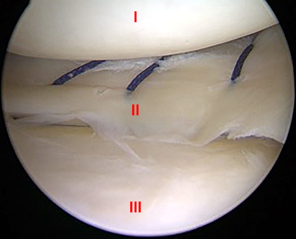 Figura 4: Imagen artroscópica de rodilla derecha, vista desde el portal anteromedial que muestra que muestra la sutura meniscal fuera- adentro con 3 puntos verticales de sutura no absorbible, polidioxanona N° 1 (PDS). I: Cóndilo Femoral Interno. II: Puntos Verticales con PDS en Curno Post. Menisco Int. III: Meseta Tibial Interna.