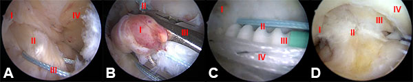 Figura 5: Imagen artroscópica de rodilla derecha, vista desde el portal anterolateral, con el paciente en posición supina y la rodilla a 90 ° de flexión. A) La sutura del haz anteromedial (AM) con FiberWire N1. I: Pared Medial Cóndilo Ext. II: Remanente Haz AM. III: Sutura. IV: LCP. B) La sutura del haz posterolateral (PL) con TigerWire No.1. I: Remanente Haz PL. II: Sutura. III: Pinza Scorplo. C) La colocación del ancla ventado BioCompuesto SwiveLock 4,75 mm para fijar el haz anteromedial con el TigerTape 2mm (Internal Brace) carcado en el ojal. I: Pared Medial del Cóndilo Ext. II: Sutura Haz AM. III: SwiveLock 4.75 mm Biocompuesto. IV: TigerTape 2mm (Internal Brace). D) La reinserción del LCA en su huella femoral. I: Cóndilo Femoral Externos. II: LCA Reinsertado. III: LCP. IV: Cóndilo Femoral Interno.