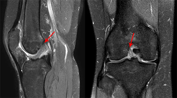 Figura 6: Imágenes de RMN de rodilla derecha a los 11 meses luego de la reparación primaria del LCA. A) Corte sagital que muestra una imagen continua, heterogénea e hiperintensa del LCA. Flecha: LCA reinsertado. B) Corte coronal que muestra una imagen continua, heterogénea e hiperintensa en casi toda la extensión del LCA. Flecha: LCA reinsertado.