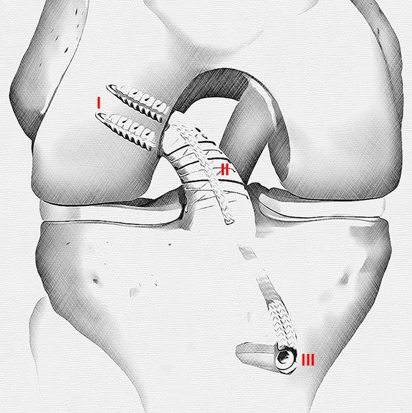 Figura 7: Dibujo que muestra el resultado final con la técnica de reparación primaria artroscópica con fijación femoral independiente de cada haz con 2 anclajes ventados BioCompuestos SwiveLock de 4,75 mm (Arthrex) aumentado con Tigertape 2mm (Arthrex) como internal brace fijado en la tibia con un anclaje SwiveLock de 4,75 mm. I: SwiveLock 4.75 mm. II: TigerTape 2mm (Internal Brace). III: SwiveLock 4.75 mm.