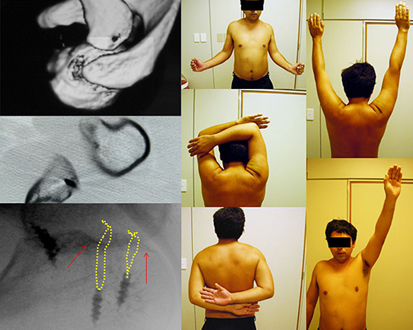 A continuación se realizó la reinserción anatómica del tendón del subescapular y cápsula, mediante 1 anclaje óseo similar a los utilizados, con el objetivo de evitar una desinserción durante el periodo de rehabilitación. En el postoperatorio se indicó inmovilización con un cabestrillo modificado manteniendo el miembro en rotación neutra, limitando la rotación interna del brazo por 3 semanas para evitar contracturas con pérdidas de la rotación externa. Posteriormente se permitió ejercicios pendulares de movilidad pasiva y activos asistidos en forma progresiva. A la 12ª semana el paciente alcanzo 90 grados de abducción y flexo extensión completa sin evidencia de inestabilidad. Al año de evolución postoperatorio, movilidad completa, con un hombro estable, retornando a sus actividades deportivas (Fig. 10). Se evaluó al paciente a los 60 meses con el “Score” del D.A.S.H y Constant. Se obtuvo una recuperación funcional satisfactoria con déficit funcional de rotación externa de 10º. Se corroboró consolidación del fragmento osteo-condral mediante la utilización de la T.A.C. y Rx. simple (Fig. 11).
