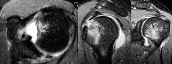Figura 5: R.N.M: se aprecia la lesión del complejo cápsulo-labral posterior ( Bankart Reversa) y el edema contusivo de la cabeza humeral.