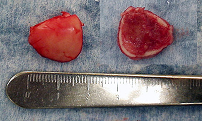 Figura 7: Aspecto macroscópico del fragmento libre Osteo-condral con una delgada capa de hueso esponjoso subcondral.