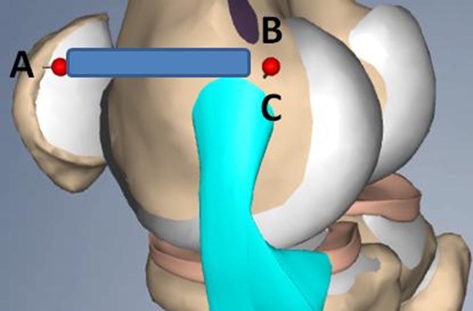 Figura 1: Región posteromedial de rótula y fémur. A) 2/3 proximales de rótula. B) Tubérculo del aductor. C) Epicóndilo medial.