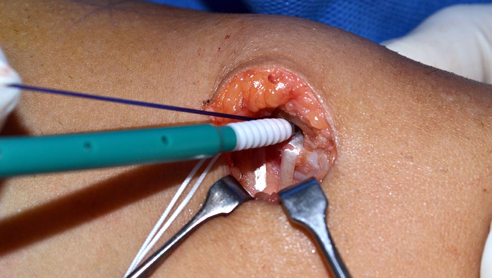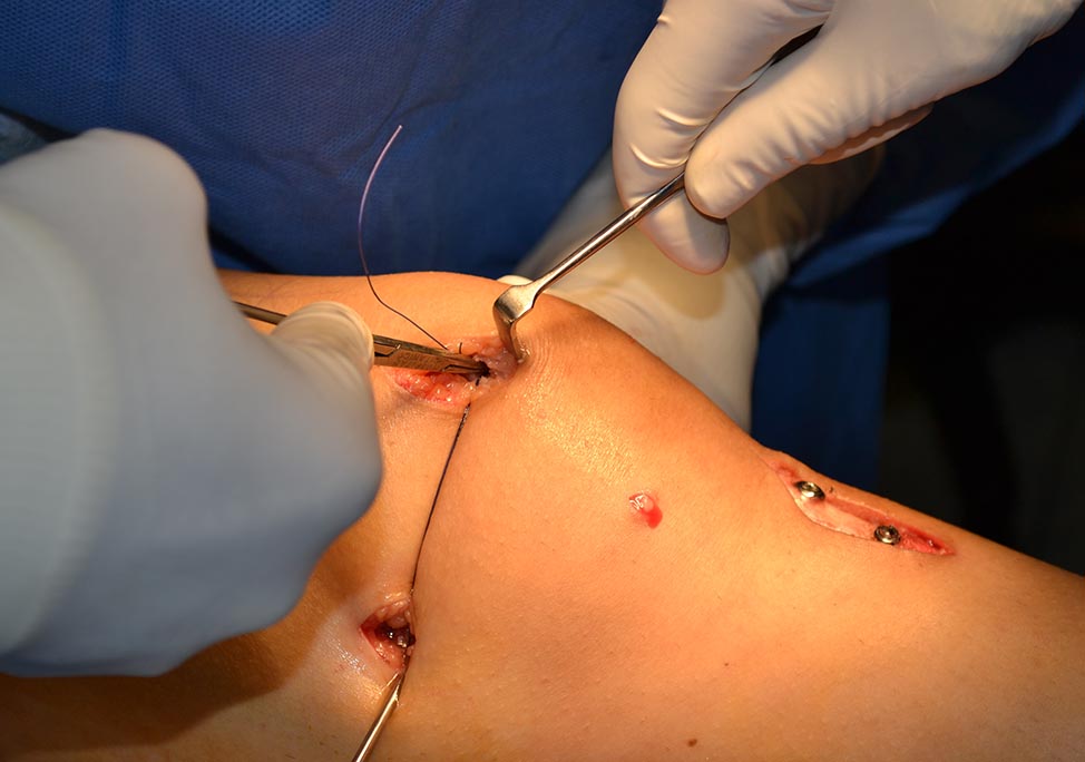 Figura 10: Región medial de rodilla izquierda, fijación de cabos tendinosos libres en rótula. Fotografía intraoperatoria, Hospital Británico de Buenos Aires.