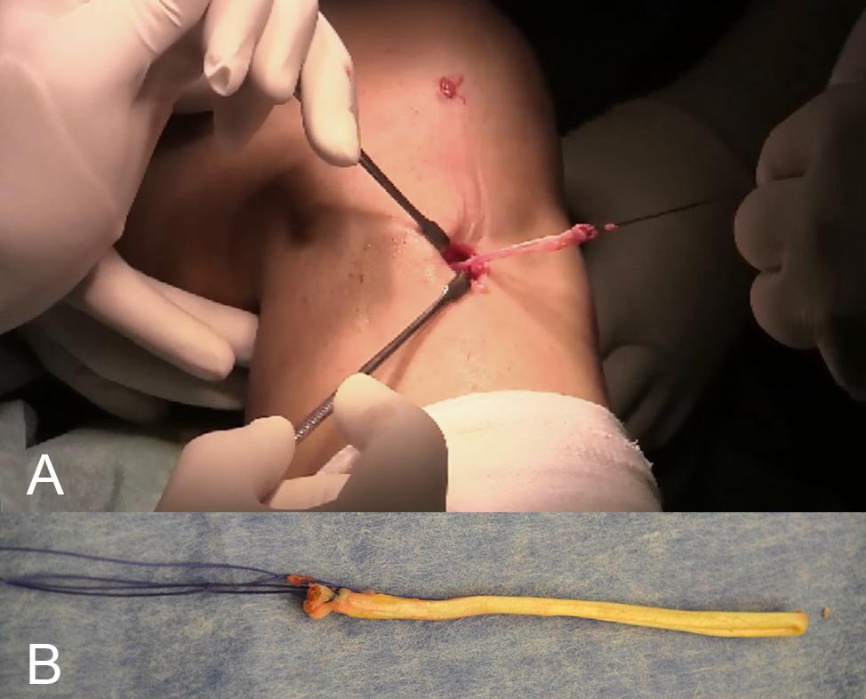 Figura 2: A) Incisión en región antero interna de rodilla izquierda. B) Tendón recto interno cosechado. Fotografías intraoperatorias, Hospital Británico de Buenos Aires.