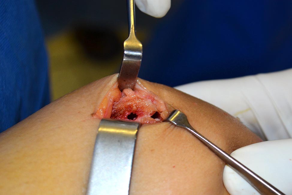 Figura 4: 2/3 proximales del borde medial de rótula izquierda con 2 túneles. Fotografía intraoperatoria, Hospital Británico de Buenos Aires.