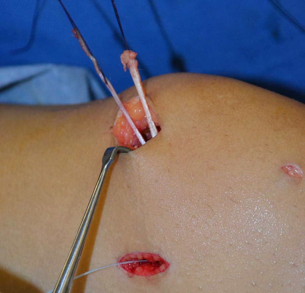 Figura 9: Región medial de rodilla izquierda, presentación de cabos libres tendinosos para fijación rotuliana. Fotografía intraoperatoria, Hospital Británico de Buenos Aires.