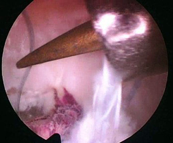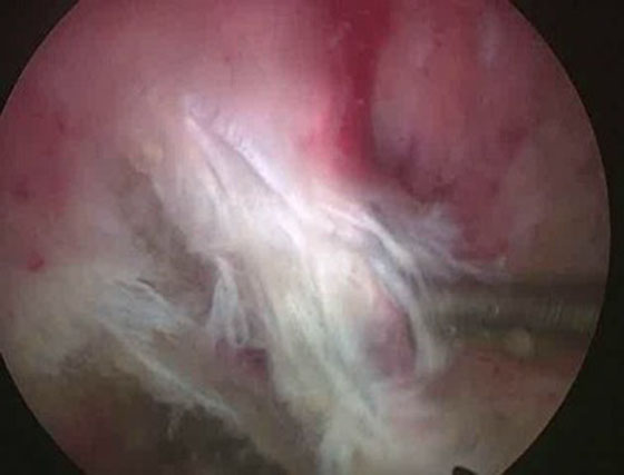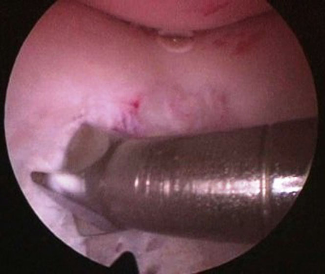 Se insufla el manguito neumático y se comienza la artroscopia por los portales anteromedial y anterolateral, se reconoce la lesión, se solucionan lesiones asociadas (meniscales, condrales, cuerpos libres) y se pasa a realizar el túnel femoral. Se localiza la hora 12 del intercóndilo, se visualiza la tróclea femoral y se ubica el sitio del túnel femoral (hora 1 rodilla derecha, hora 11 rodilla izquierda) (Fig. 2). Este túnel debe estar lo más alto posible en el intercondilo para colocar un injerto bien “vertical”. Realizamos este paso primero, haciendo el túnel desde el portal anterolateral, para evitar la dificultad de realizarlo después de la liberación capsular posterior que nos dejará menor cantidad de líquido intraarticular, y consecuentemente menor distensión dificultando la visión. Identificado el sitio de inserción, y sin resecar las fibras remanentes se coloca la fresa del diámetro a utilizar de manera de buscar que queden unos 3 mm desde la parte periférica proximal de la fresa hasta el cartílago articular del fémur, se pasa a través de la fresa canulada un clavo guía, se retira la fresa para confirmar la ubicación y se realiza el túnel de 20 o 25 mm de largo, de acuerdo al tipo de injerto que utilicemos. A continuación se ubica el espacio entre las fibras remanentes del LCP y el LCA, se debrida con shaver para dejar permeable este espacio, que nos permitirá más tarde traer el injerto desde la inserción tibial hacia la parte anterior de la rodilla (Fig. 3).