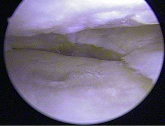 Como primer paso se realiza una Artroscopía. Esta nos permite realizan un diagnóstico de certeza de la lesión, como así también tratar la patología asociada intraarticular (Fig. 1).