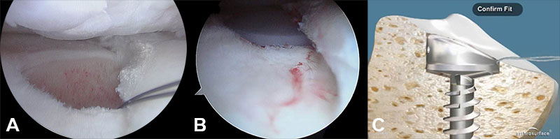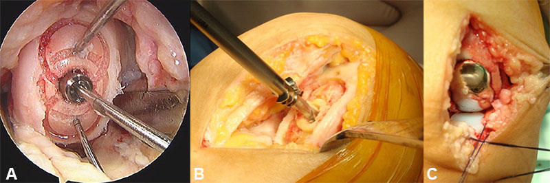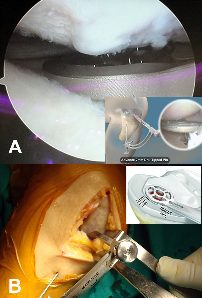 Componente tibial: el componente tibial puede ser colocado bajo asistencia artroscópica o de manera abierta bajo visualización directa.