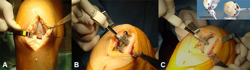Figura 4: A: Lesión condral extensa en cóndilo interno por vía abierta, B y C: Guía femoral con la elección del tamaño del implante a trabajar