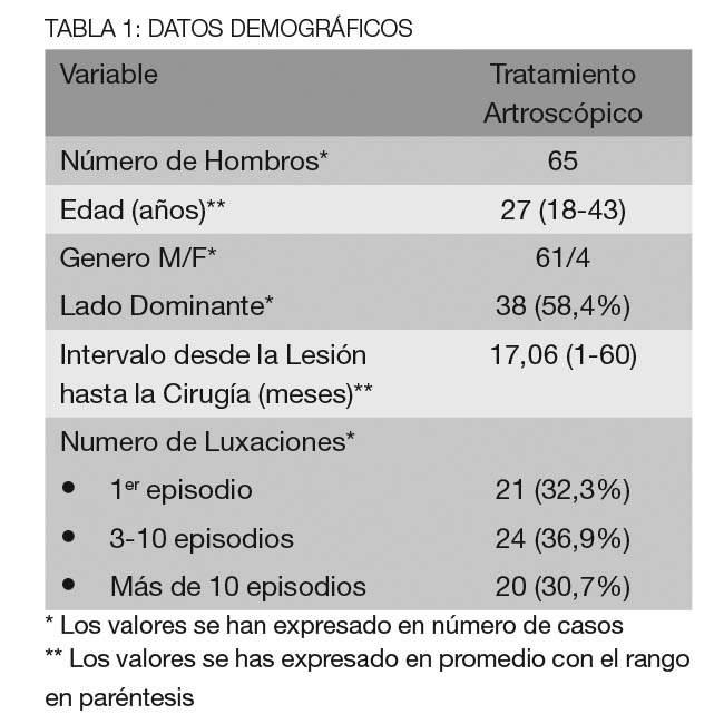 En un período de 1 año y 8 meses, entre enero del 2006 y septiembre del 2007, fueron realizadas 238 intervenciones quirúrgicas por inestabilidad de hombro. La totalidad de las mismas fue realizada por el mismo cirujano ortopedista especializado en cirugía de hombro, perteneciente al departamento de cirugía de hombro y artroscopía del Sanatorio Allende. Ciento setenta y un (171) pacientes presentaron inestabilidad traumática antero inferior de hombro, de los cuales 65 hombros en 64 pacientes cumplieron con los criterios de inclusión. El promedio de edad fue de 27,5 años (18-45 años) con un seguimiento promedio de 23,2 meses (12-50 meses). El tiempo desde el comienzo de la sintomatología hasta la intervención quirúrgica fue de 17 meses promedio (1-60 meses). Los datos demográficos se muestran en Tabla 1. Del total de pacientes evaluados, en 21 hombros (32,3%) se realizó la intervención quirúrgica luego del primer episodio, 24 hombros (36,9%) tuvieron entre 3 y 10 episodios de luxación traumática y 20 hombros (30,7%) tuvieron más de 10 episodios de luxación previa a la reconstrucción artroscópica. Se utilizaron 4 arpones promedio (2-6 arpones). En cuanto a la marca comercial de los arpones, la más frecuentemente utilizada en nuestra serie, correspondió a arpones de titanio fastac de 2,8 mm. y arpones biosuturetac de 3 mm. de Arthrex (Arthrex, Naples, FL), utilizados en 58 casos (89,2%), los restantes 7 casos (10,7%) la reconstrucción se realizó con arpones de titanio de 3 mm Stryker. Debemos tener en cuenta de que por la época de la serie que presentamos todas las reconstrucciones fueron realizadas con técnica de arpón más labrum, sin haber aplicado técnicas modernas de reconstrucción como son remplissage o plicaturas capsular posteroinferior de rutina.