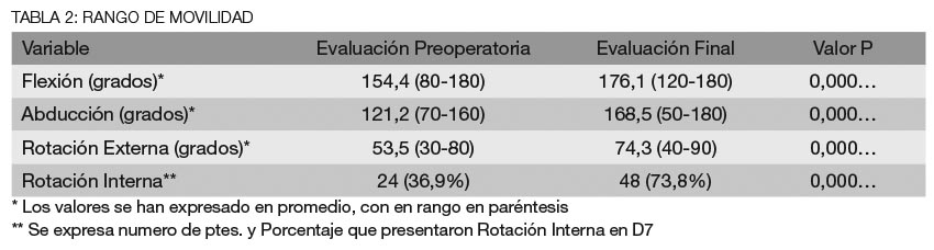 Con respecto a la evaluación del rango de movilidad, los valores promedios preoperatorios fueron de 121,2 grados (70-160) para la abducción y de 53,5 grados (30-80) para la rotación externa. En la evaluación final los valores promedios fueron de 168,5 grados (50-180) para la abducción y de 74,3 grados (40-90) para la rotación externa, con un valor de P de 0,000 estadísticamente significativa (Tabla 2).