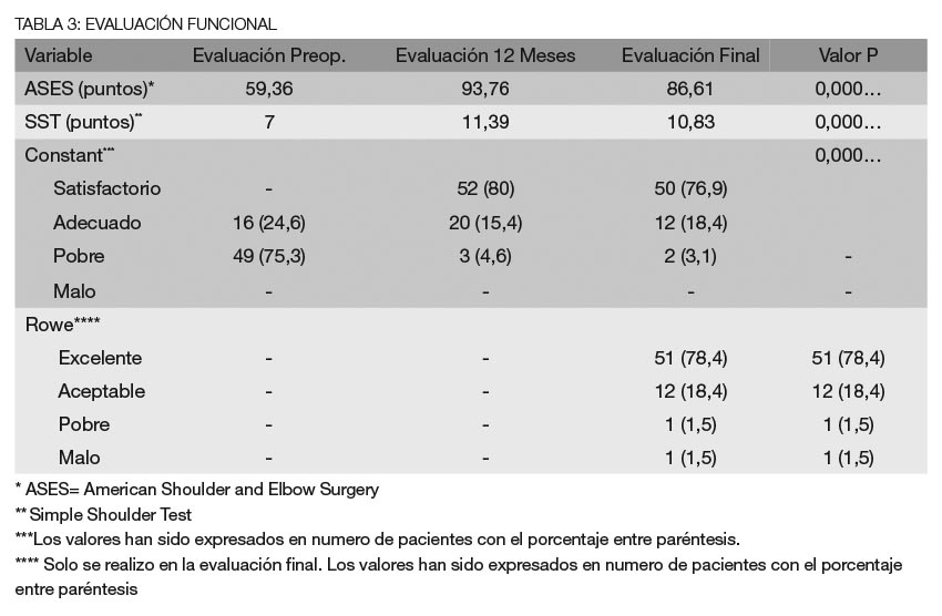 El score de ASES, el Simple Shoulder Test y el Score de Constant mostraron una diferencia significativa a favor del tratamiento a los 12 y 24 meses con respecto a la evaluación pre-operatoria. La escala de Rowe arrojo resultados Excelentes en 51 casos (78,4%), aceptable en 12 casos (18,4 %), y 2 casos (3,1%) de pobre y mal resultado (Tabla 3).