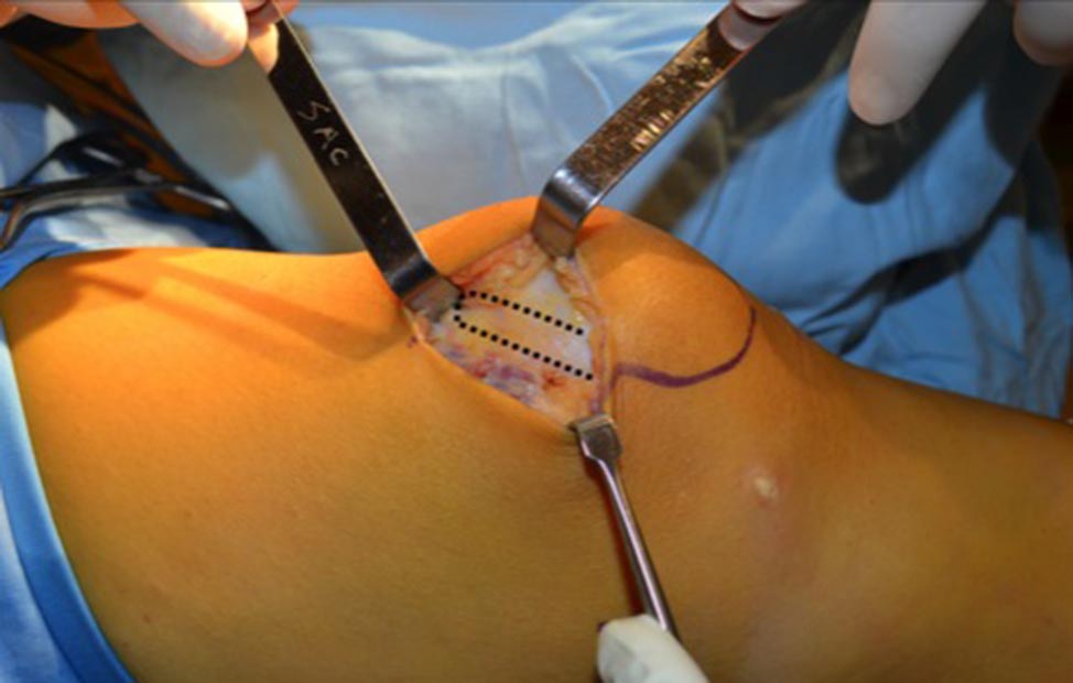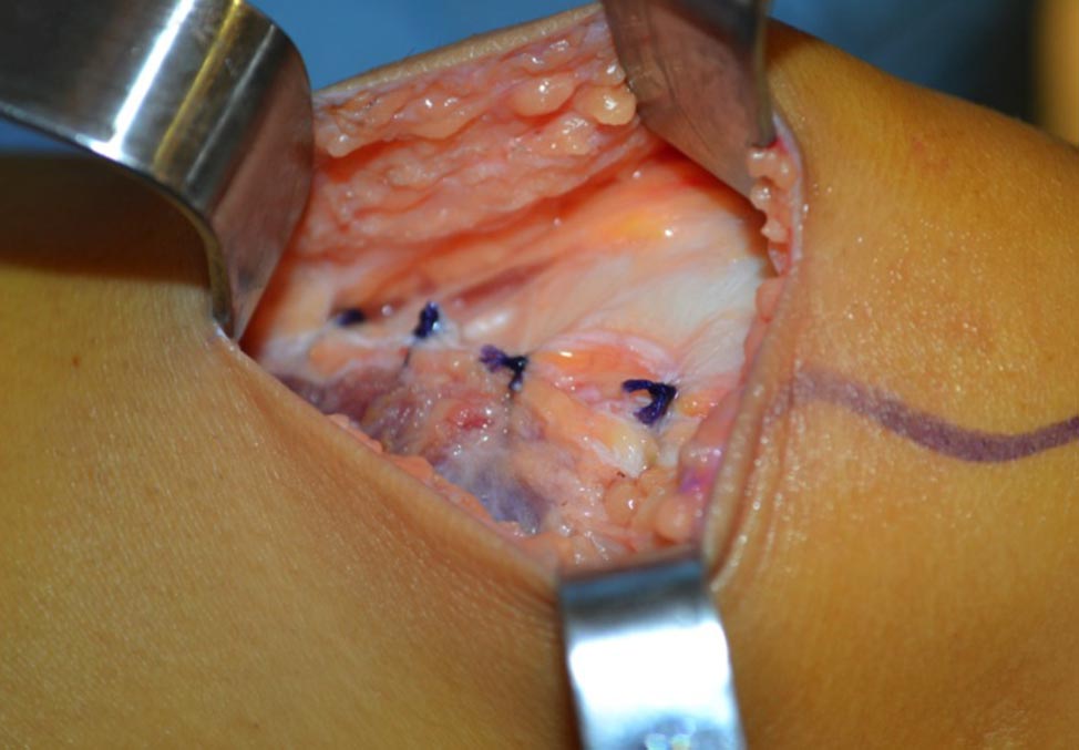 Posteriormente se realiza un abordaje de 4 a 5 cm desde el polo superomedial de la rótula hacia proximal (Fig. 1). Se diseca por planos hasta identificar el borde medial del tendón cuadricipital. Se continúa con la disección hasta visualizar completamente el mismo (Fig. 2). En este momento se mide la distancia entre el borde superomedial de la rótula y la inserción femoral de LPFM. Esta distancia es habitualmente entre 6-7.5 cm, dependiendo de la contextura del paciente.