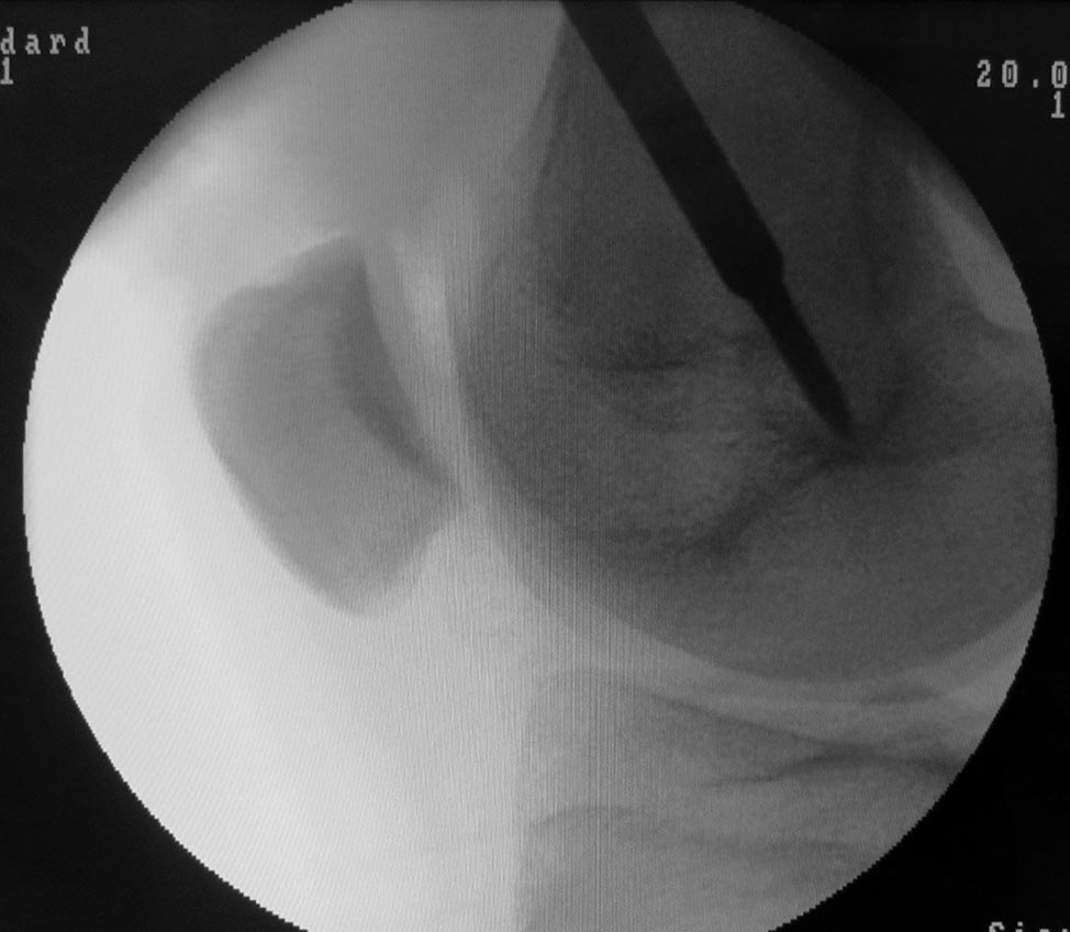 Se toma un injerto del tendón cuadricipital (TC) de espesor completo dejando un margen de 2-3 mm en la zona medial, para permitir un cierre del defecto tendón-tendón. Es importante evitar abrir la cápsula articular. Para ello es conveniente comenzar la disección aproximadamente 3 cm proximal al polo superior de la rótula donde el tendón se encuentra bien diferenciado de la cápsula articular, y luego continuar hacia proximal (Fig. 3). Finalmente se continúa hacia distal con una disección subperióstica hasta la inserción anatómica del LPFM en la rótula. Este gesto permite ganar 1-1.5 cm de longitud final del injerto. Se mantiene la inserción rotuliana del TC y se lo gira sobre sí mismo de modo que la cara posterior quede anterior y viceversa. Se fija el extremo distal del tendón con puntos tipo Krakow y se refuerza la inserción rotuliana con puntos en 8, ambos con suturas no absorbibles tipo Fiberwire. Se diseca el plano entre vasto medial oblicuo (VMO) y el retináculo medial. Se identifica con el arco en C, en un perfil estricto, el punto anatómico de inserción femoral del LPFM. Este paso es crítico al momento de la reconstrucción. En pacientes esqueléticamente maduros utilizamos el punto de referencia radiográfico descripto por Schöttle.7 En pacientes esqueléticamente inmaduros fijamos el injerto en la región epifisaria inmediatamente distal al cartílago de crecimiento (Fig. 4), ya que este punto de referencia no es fiable en pacientes con fisis abierta.8